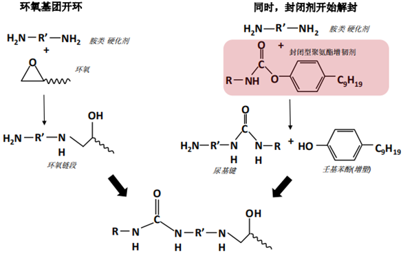 環氧樹脂具有很高的結構強度,但有時候同時需要高強度和高韌性,這可以通過降低交聯密度和增加彈性鏈段來實現。封閉型異氰酸酯增韌劑可以在增加彈性鏈段的同時降低交聯密度。增韌機理如下圖所示