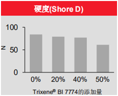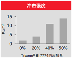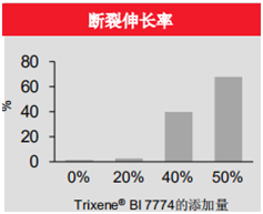分別測試了斷裂伸長率、沖擊強度、硬度(Shore D)。隨著Trixene®BI7774添加量的增大,環氧樹脂體系的斷裂伸長率和沖擊強度有十分明顯的增加,同時硬度也隨著Trixene®BI7774添加量的增大有所下降,并且當Trixene®BI7774添加量較大時對硬度影響比較明顯。